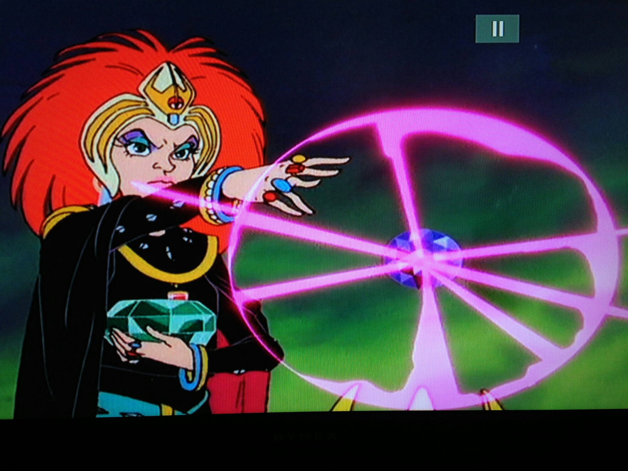 In the dungeon, Rainbow says they need to escape. I guess the accommodations aren’t to her liking. I don’t blame her. Gothic motif, no thank you. It’s time for the horses to get their 15 minutes. Starlight has On-X create a diversion, he’s off to save Rainbow. Princess doesn’t appreciate all the noise, and looses her curlers over it. She doesn’t want a horse in her room. She must not be related to Catherine the Great. Anyhow, he retrieves the belt, and Princess is mad about the teeth marks. That’s a first. No matter, the belt is back where it belongs, and Rainbow and Krys are out of there. At least until Princess, now in full diva attire, uses her powers to banish them. The rainbow can’t outrun her dark magic, and they’re taken to a prison planet.