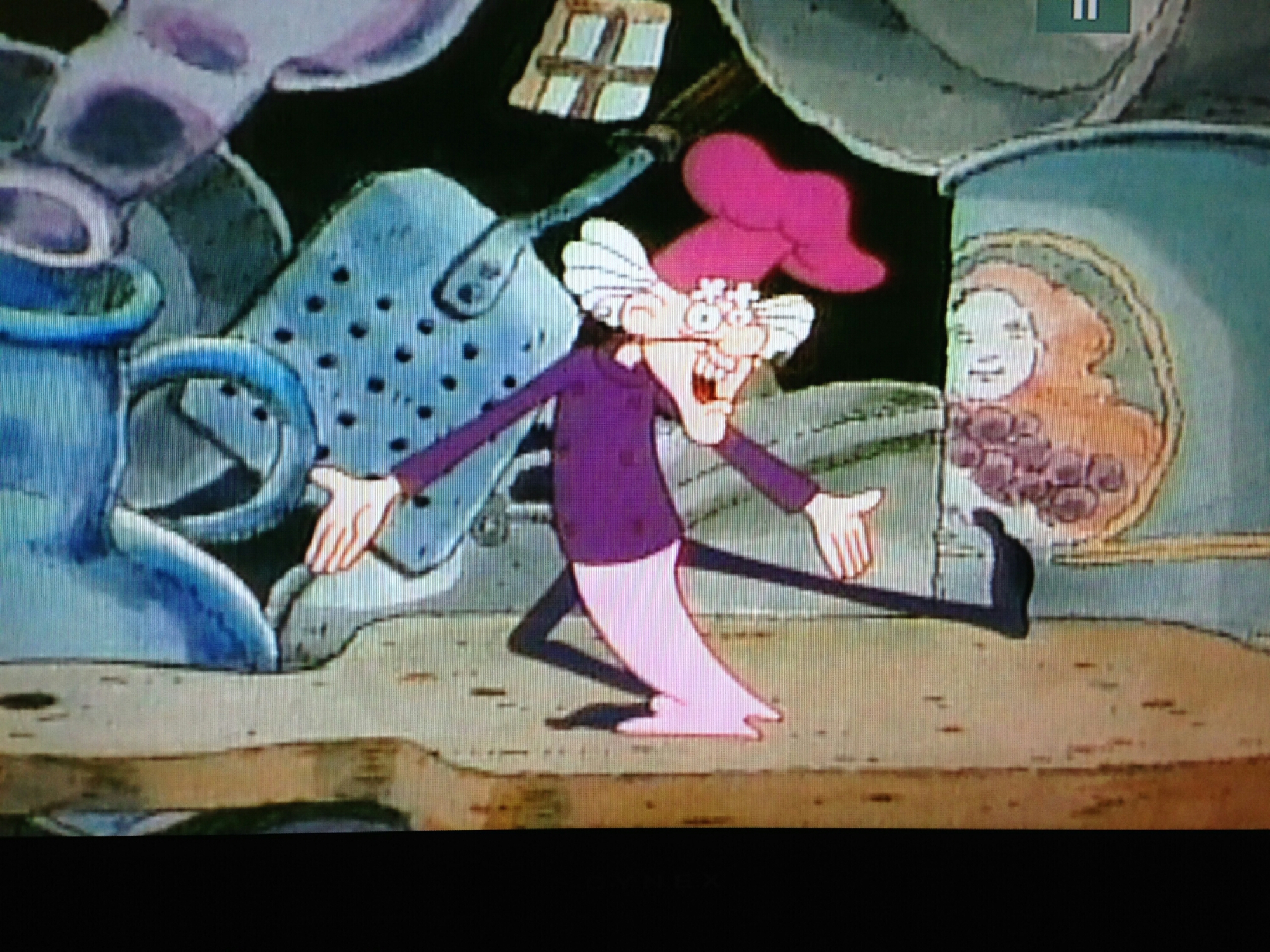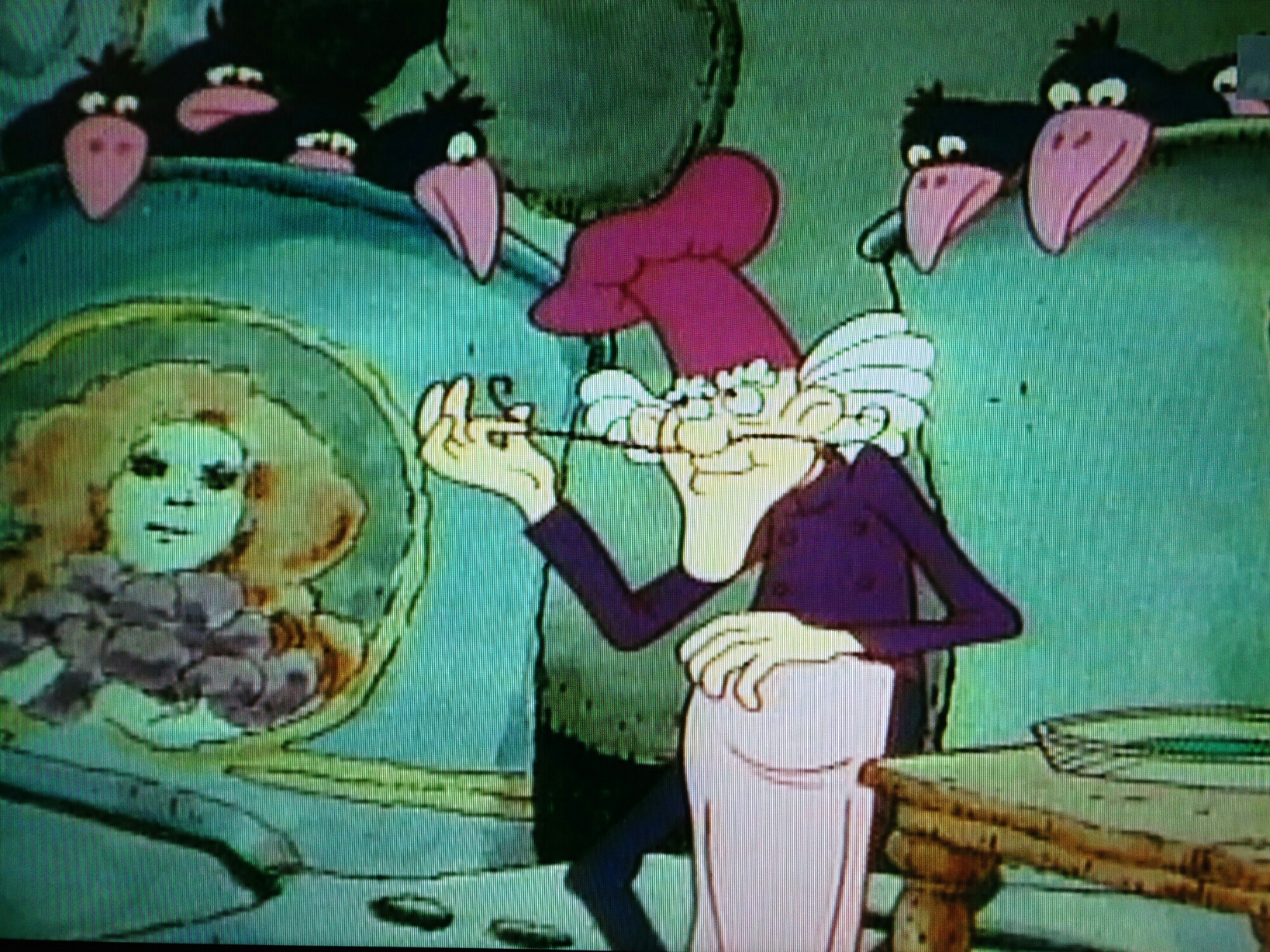 The birds attack, and our title character is defended by the whomping willow, that hadn’t yet been cast in Harry Potter. She calls him her official scarecrow. His evil (?) plan thwarted, the Pie Man cries, and vows to get those berries. Then he states his full title, and does a little dance, ending in jazz hands. No, seriously. The only thing peculiar about this guy, aside from being the the only adult around, is that he seems a little light in the loafers. C’mon, affinity for purple, loves baking, breaks out into song and dance, gurl.