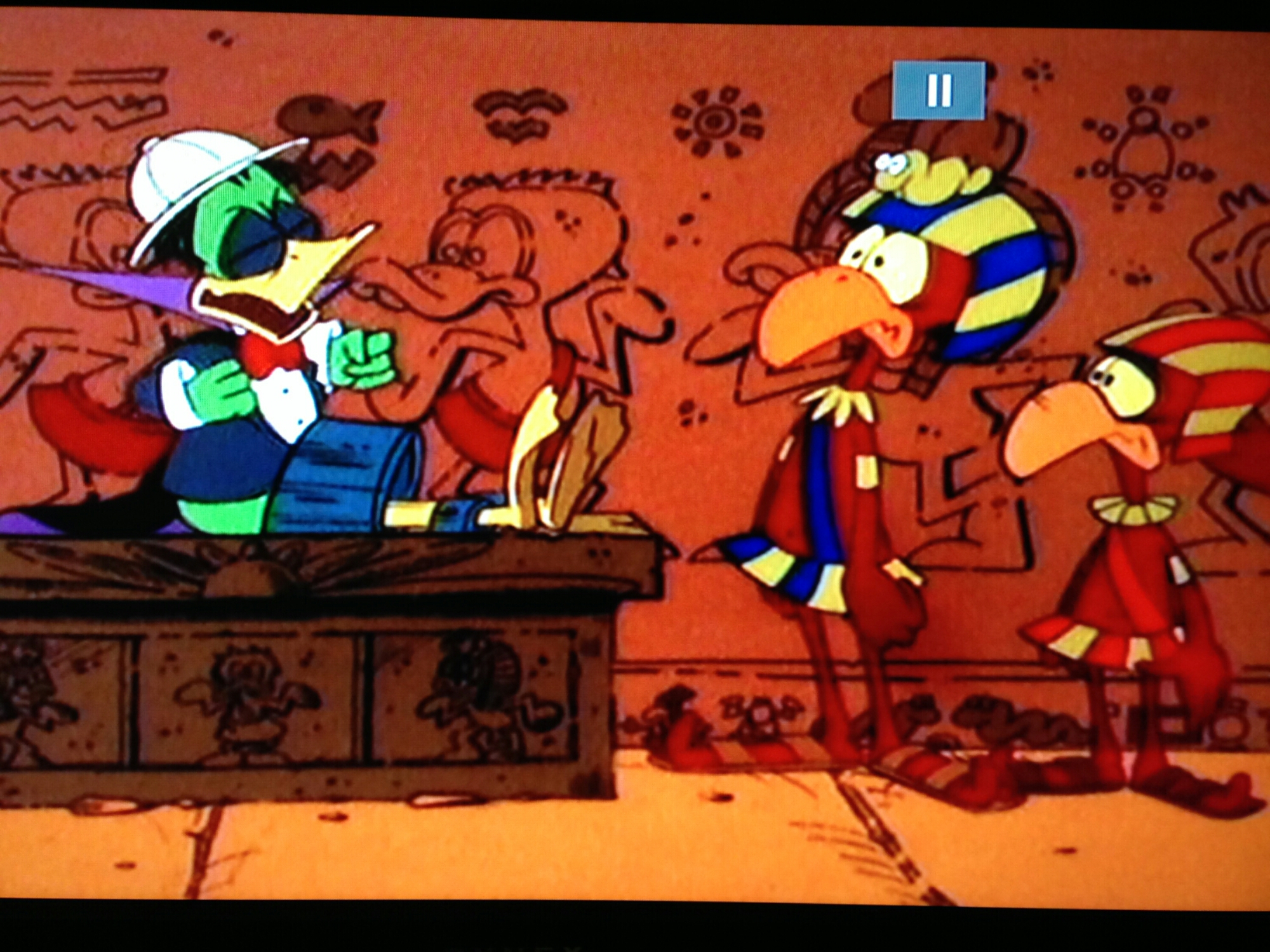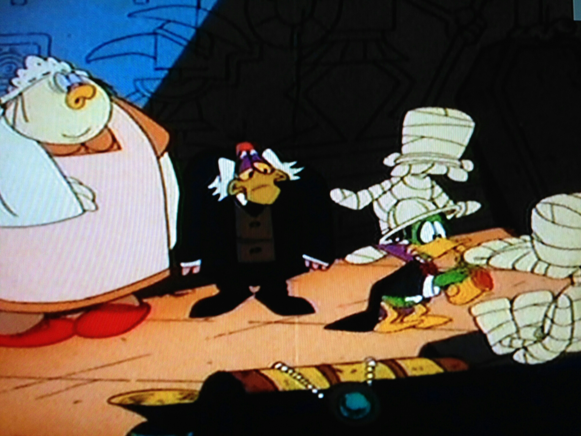Meanwhile, Igor is telling the Count about his ancestors. We hear the tale of the Archduck that explored a pyramid in Egypt, and was never heard from again. Igor makes mention of the mystic saxophone, yes, mystic saxophone, that gives whoever plays it the power of life and death. Duckula just wants to use it to be famous and fill stadiums. Poor Igor, he wanted a bloodthirsty Master, and instead he got this. He hopes the sax will make the Count evil. As the crows ponder how they’ll travel the 3000 miles to Egypt, the Count runs down to an upright coffin, announcing his destination, and the castle teleports there. There’s no in episode description for why the castle has/is a transporter. Hashtag mysteries of Castle Duckula