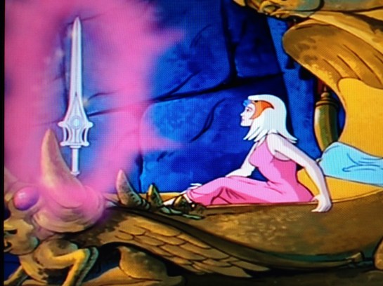 Castle Grayskull, the Sorceress’ chamber. How do we know it’s her? Because despite being in bed, she’s still wearing her eagle face diadem thing. She’s having a nightmare about Hordak holding a baby and stating that he may be defeated, but they’ll never see the child again. He fires a beam at the Sorceress and what appears to be a young Man at Arms. She wakes up, calling out “Adora”, as a sword that looks similar to Adam’s appears above her. She follows it to a door, that is opened when the sword hits it with energy. A glowing portal is there. After all this time. Can it be?