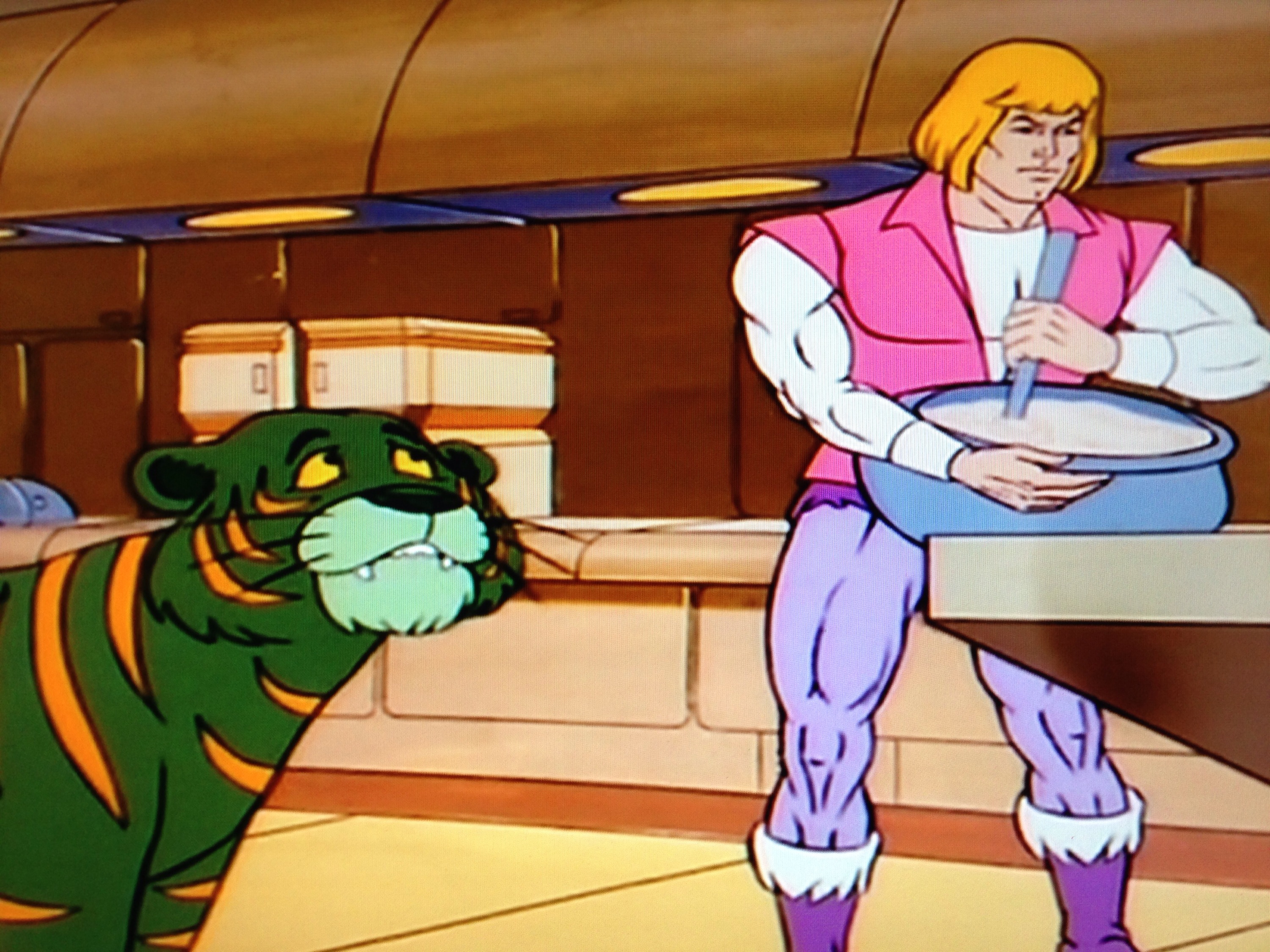 In Randor’s castle, Adam and Cringer are in the kitchen. Adam is mixing something in a bowl. Cringer wants it now, but a work of art like Adam’s famous spiced bread takes time. His words, not mine. Totally straight. Nothing out of the ordinary here. That is, until the Sorceress talks to him via telepathy, and summons him before her. Looks like Man at Arms won’t get his spiced bread. He’s still holding a grudge from missing the Eternian white party during the last pilot. Women are always ruining his time with Adam. Getting to play with He-Man is only going to work another few dozen times before he gives up. If only he knew how to quit him. Has anyone made Brokeback Grayskull yet? Someone should.