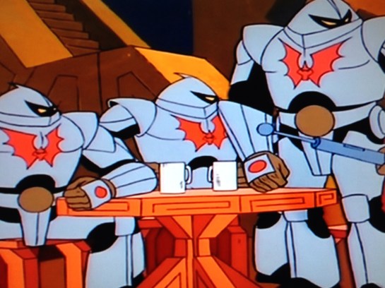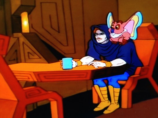 They arrive in Etheria, and it’s brighter and more colorful than Eternia. Cringer is still hungry, so they head to a nearby village, and the Laughing Swan Inn. They have live music, and a full bar. A hooded figure in the corner asks his pink friend with rainbow colored ears, Kowl, if the stranger is part of the Horde. Adam and Cringer ask for food, and the barkeep is surprised Cringer can talk. Doesn’t everybody? Cringer orders fish, and when it arrives, he sucks it clean off the bone. He’s learned a thing or two peeking through Eternian keyholes. Three metal plated people come through the door, and Cringer hides. Adam doesn’t like the look of them. The hooded stranger says they’re Hordesmen, and readies his bow. Turns out his name is also Bow. Not Beau, Bow. Gotta keep it simple, they’re marketing to girls. Ah, the 80’s.