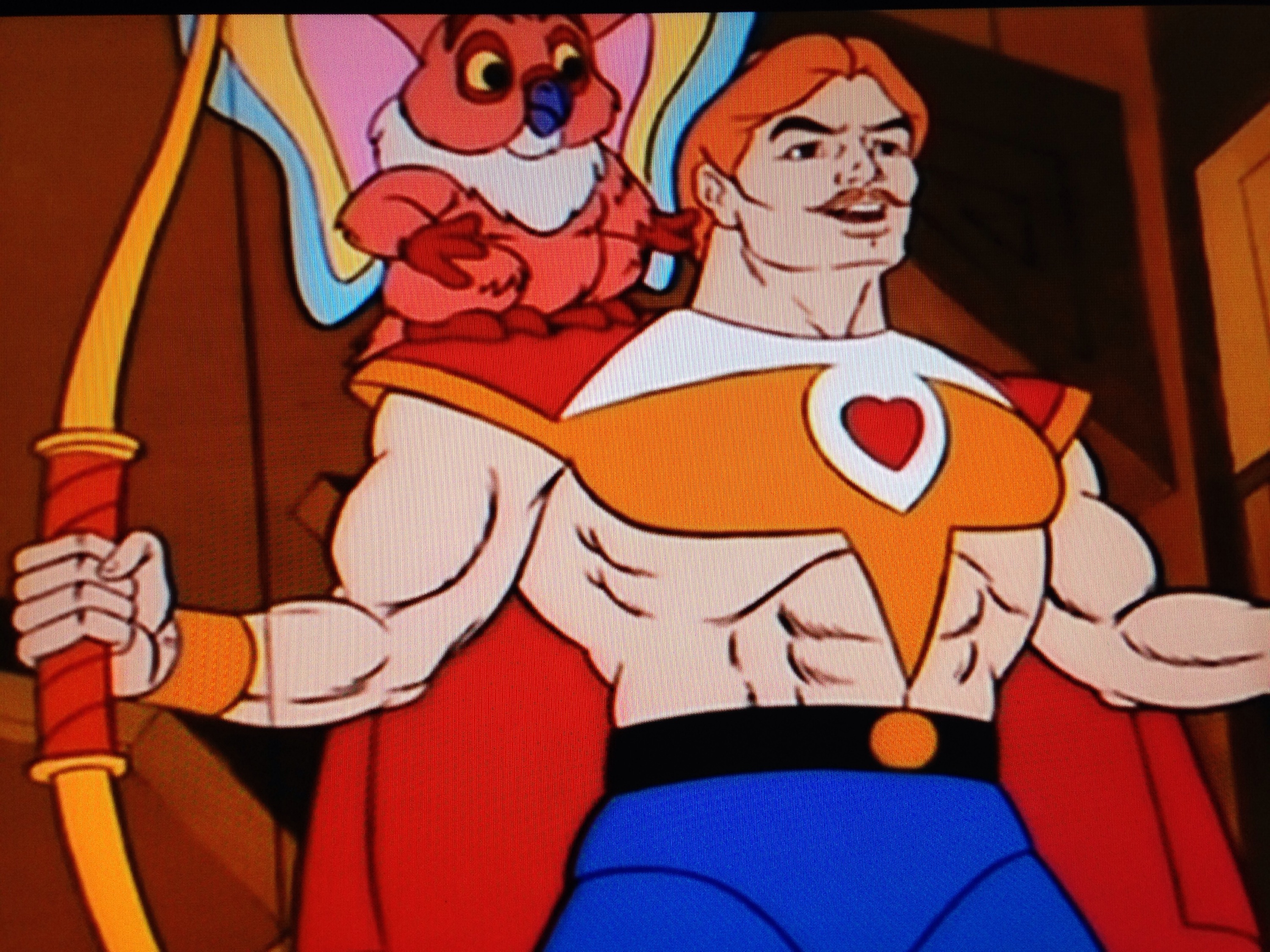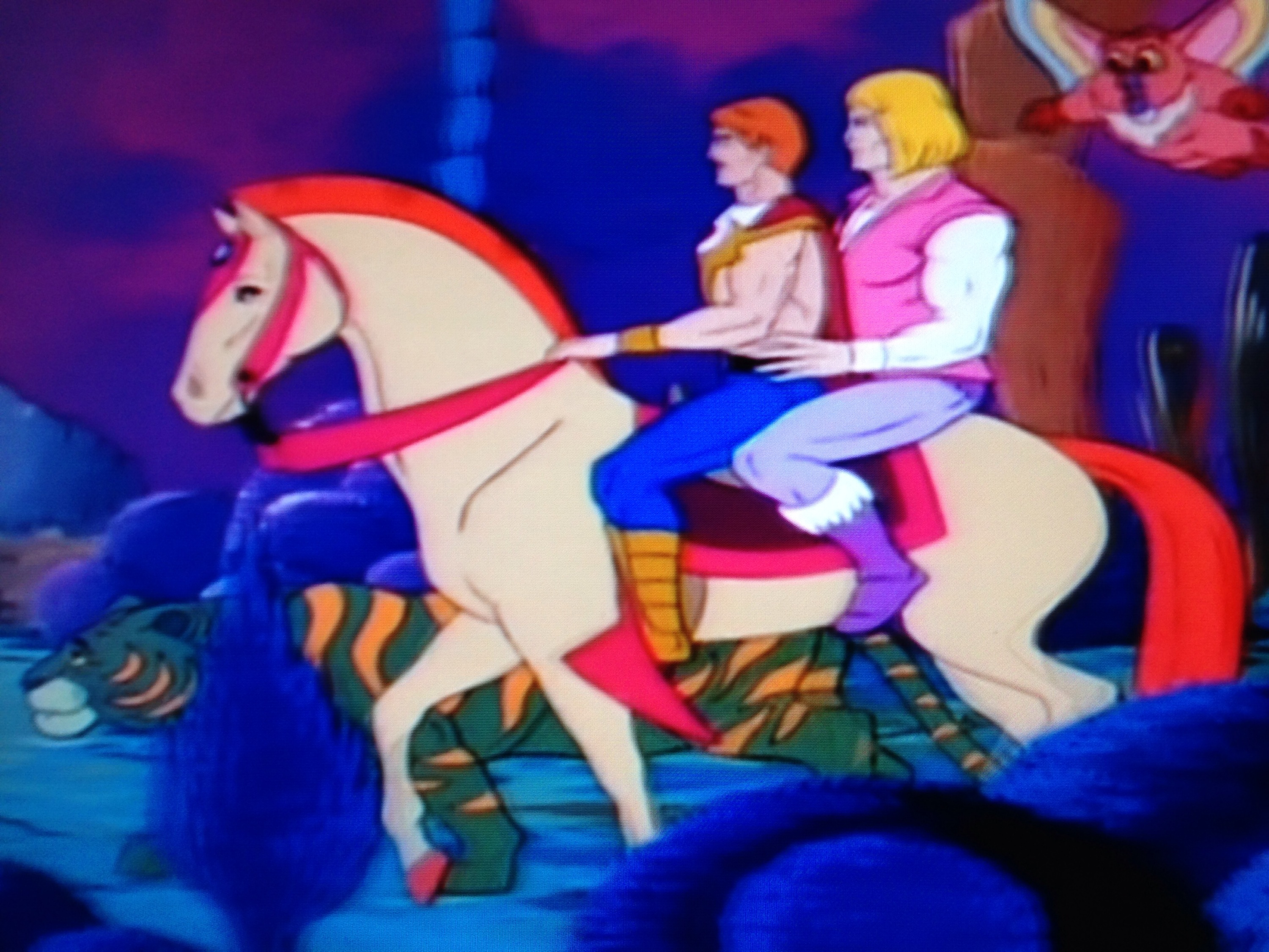 Looks like a version of Brokeback Grayskull was made after all. We see Bow and Adam on a horse, with the latter holding Bow’s waist. They’re in Whispering Woods, HQ of the rebellion. A guard jumps out , and scares Cringer up a tree. Kowl chastises him for scaring their allies. Bow orders him to go tell Glimmer that they have some new recruits. He then tells Adam of the great rebellion. Cringer comments that it doesn’t look that great. Kowl agrees.