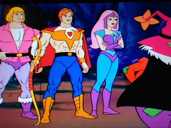 As the Hordesmen attack, Adam takes care of one, while Bow uses his bow to take out the weapons of the other two. Adam is dressed modestly compared to Bow, who is essentially wearing shoulder pads with a heart on the chest, and attached cape. Gotta show off the arms and the abs. This is for straight girls, after all. Adam and Bow fight the Hordesmen while Kowl hides with Cringer. Bow says he’s not a citizen, he’s a rebel. Adam thanks him, and Bow says it was his pleasure. Adam is far enough from Eternia that I’m sure Man at Arms won’t get jealous. What happens on Etheria, stays in Etheria.
