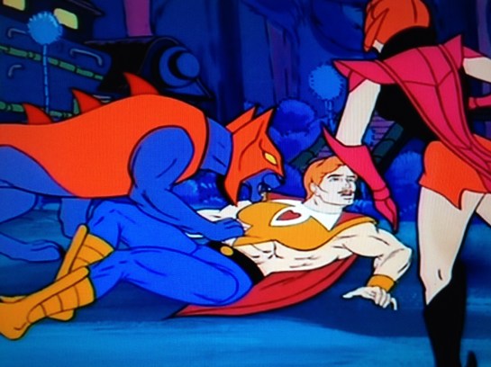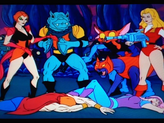 By the power of Grayskull, he has the power! About damn time, Adam. Bitch needed a dramatic entrance. Bow is caught between Scorpia at his back, and Leech draining him from the front. Not like that! 80’s kids show, people. As Bow falls to the ground, Adora says that should take care of the rebels. He-Man tells them they haven’t won yet, and to let his friends go. Adora fires on him, and he knocks the blast away, and it hits Leech. Battlecat knocks the mask off Catra, and she reverts to human form. Scorpia goes after He-Man. He says she’s not very ladylike, or much of a lady anyway. He flings her into a melon cart. Battlecat chases Catra, and before he can help, Adora orders Mantenna to go after He-Man. He uses his hexing eye beams to weaken He-Man. Sprag hits him with pepper, and Mantenna sneezes himself into a wall.