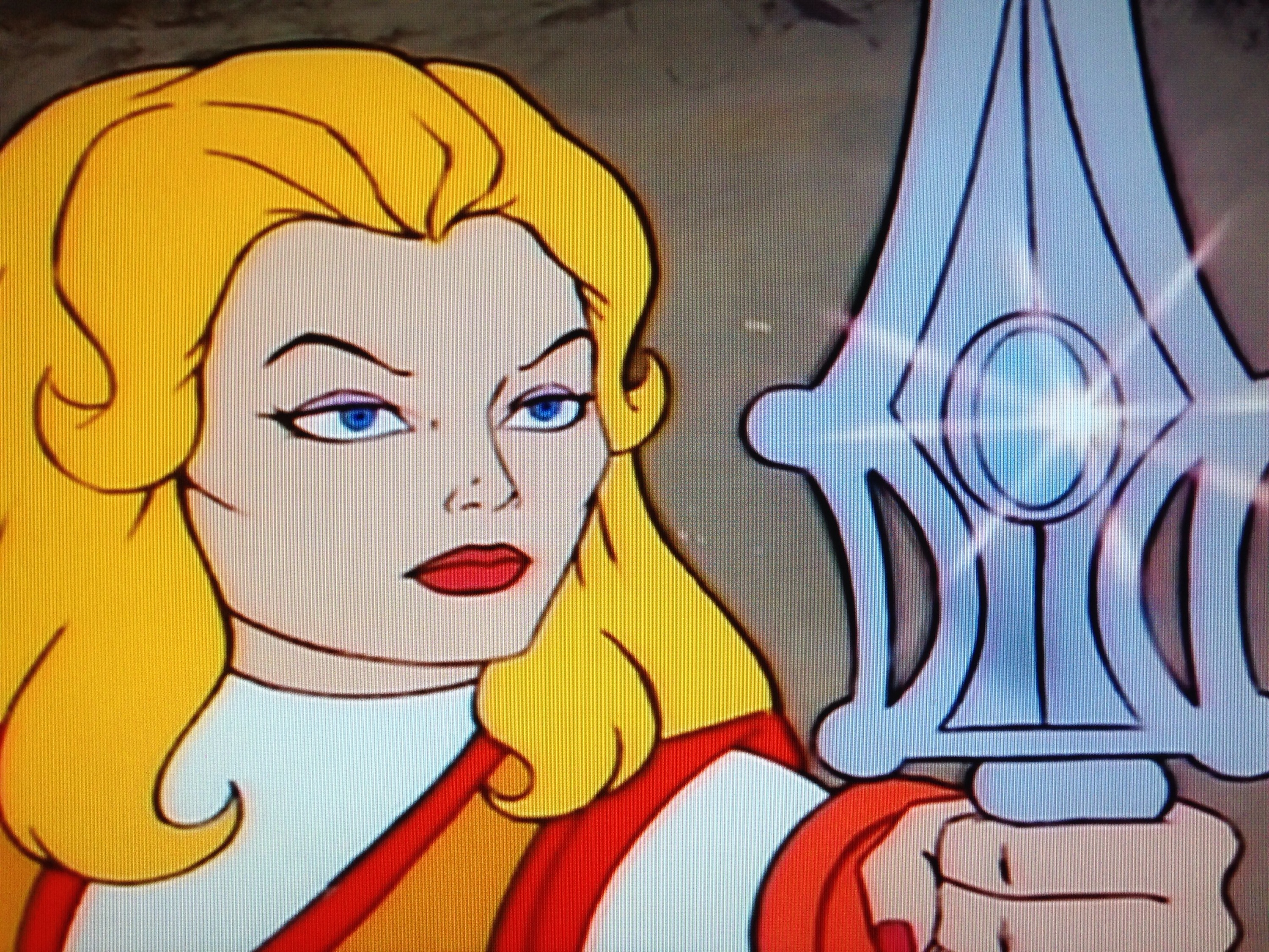 He-Man throws his sword at Adora, and knocks her gun away. Battlecat catches the sword. Adora flees, with He-Man chasing after her. Only time he’s pursued a girl in his life. She leads him into a hut and grabs a sword. He draws the sword the Sorceress have him, and breaks hers. The sword begins to glow. We see Adora’s face on the jewel. She’s the one! The one he’s been looking for! A Hordesmen blasts him from behind, and he goes down. Please don’t snap his neck after. Adora picks up the sword, as “to be continued” appears on the screen.