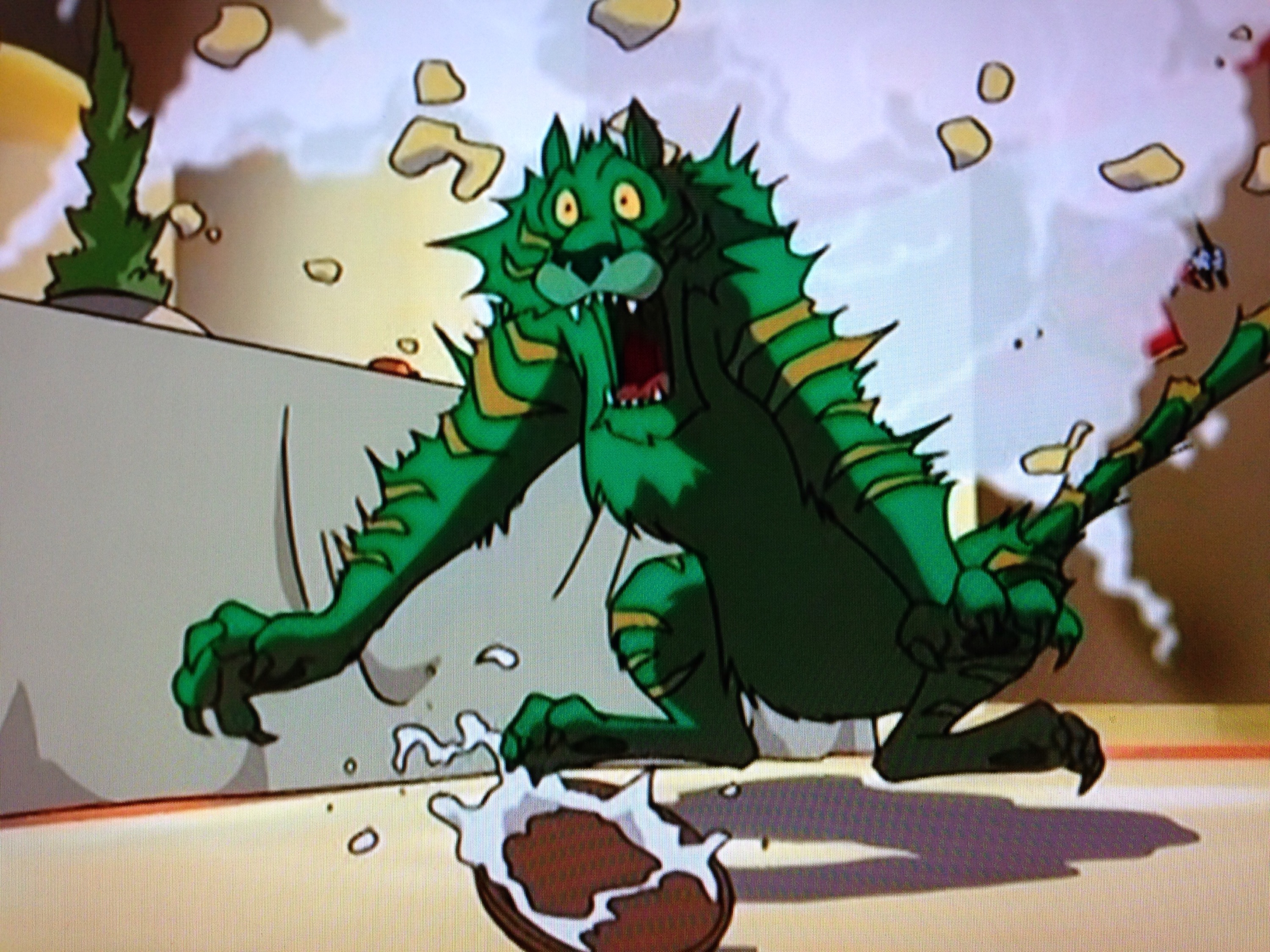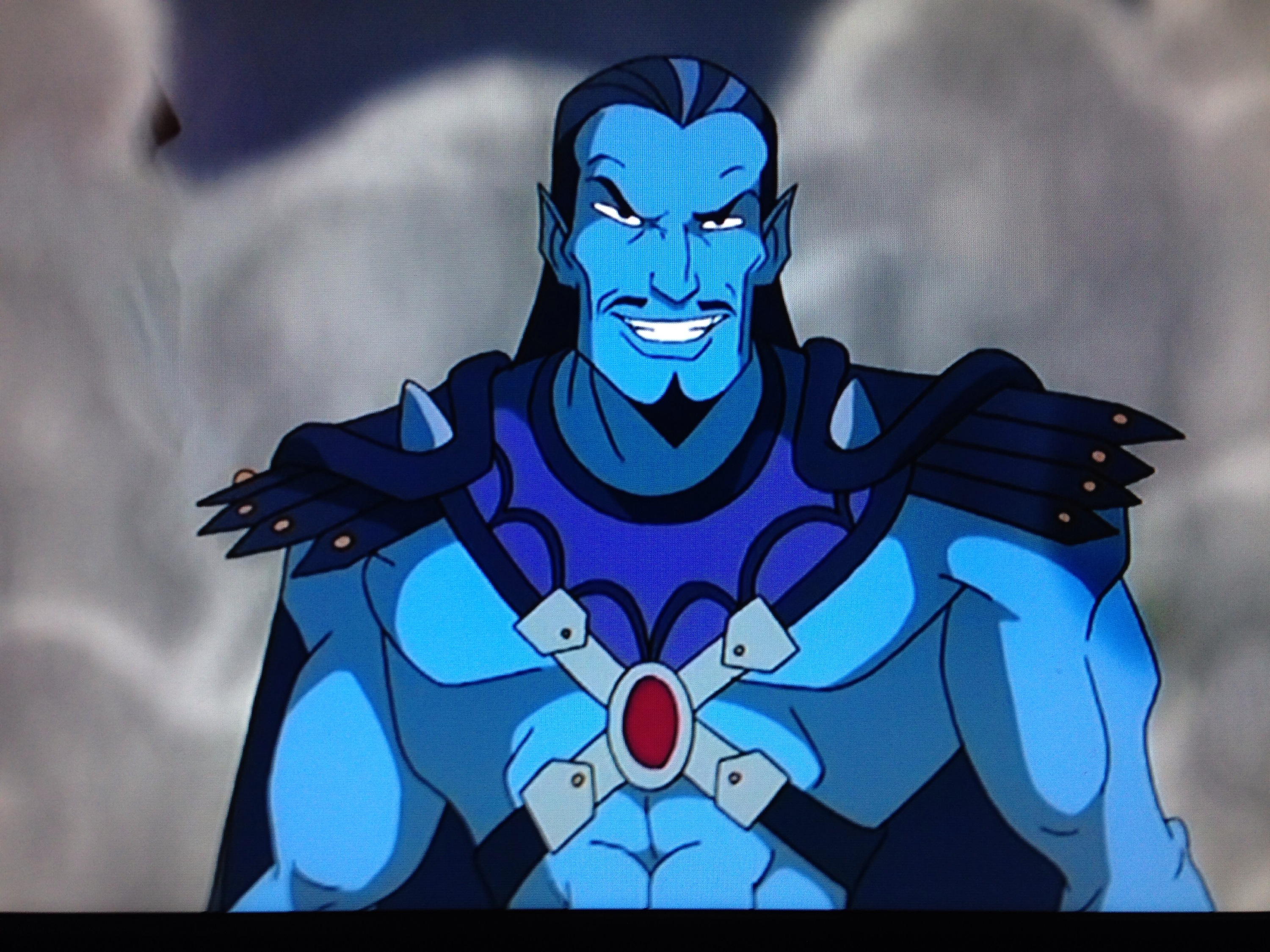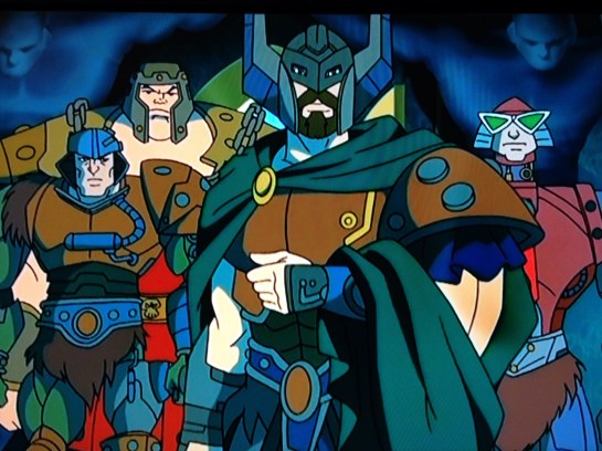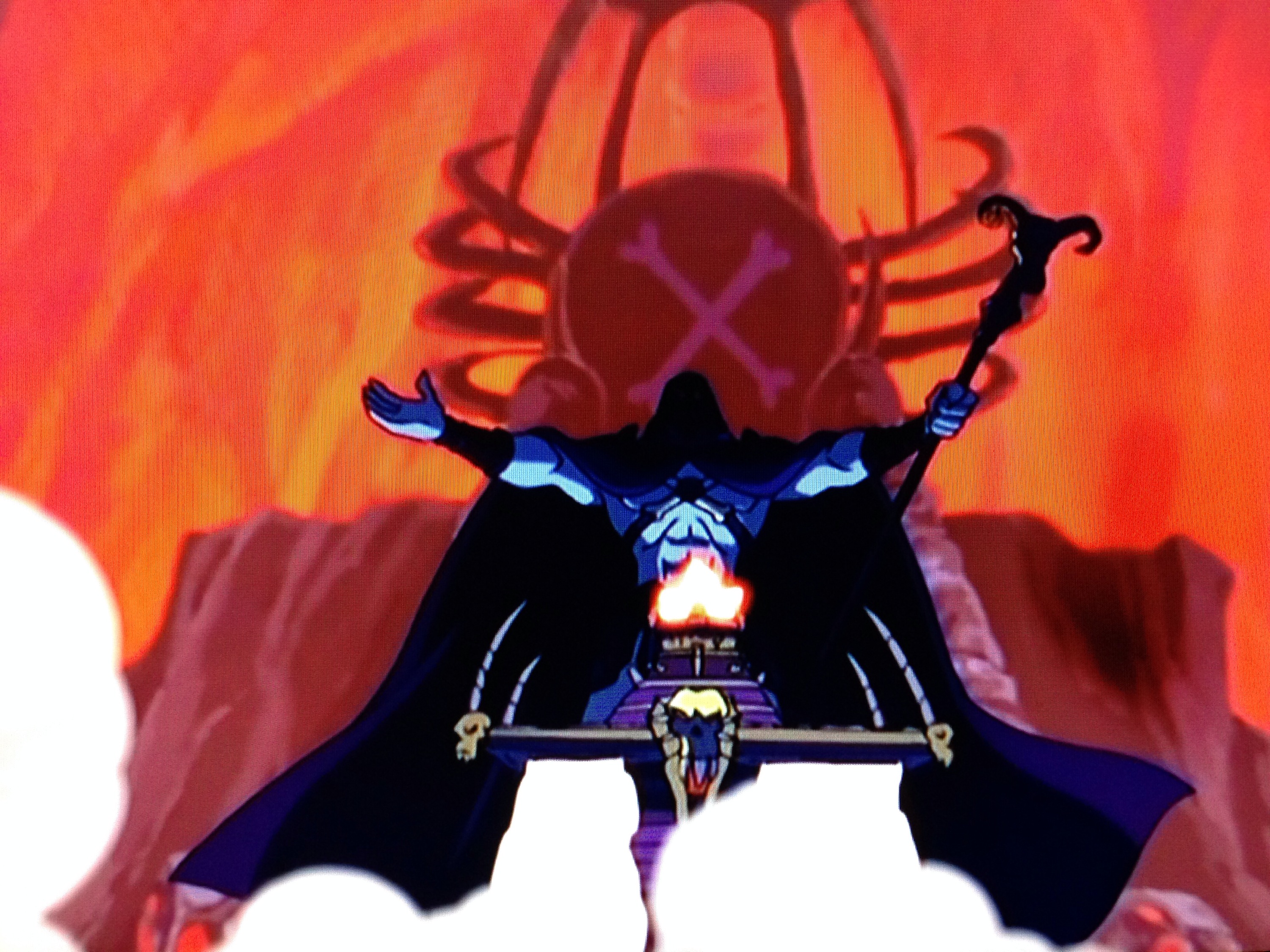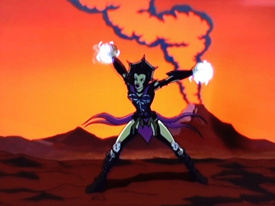 Pan through beautiful Eternian fields, and pass through a shiny wall of retaining goodness, to a desert filled with volcanoes, like it’s not hot enough. Then we see Snake Mountain. Evil-Lyn, Beast Man, Trap-Jaw, and Tri-Klops gather. Trap-Jaw says that HE has come up with a device to destroy the mystic wall. In the throne room, a shrouded Keldor pets Panthor as he reveals his plan to break down the mystic wall. His device lacks a crucial element. It’s taken nearly two years to find it. On cue, Mer-Man appears holding a giant red crystal. Evil-Lyn quips that he could have taken a minute to clean it up. Which he does. By rubbing it on Beast Man. Keldor places it in the device, and tells no one in particular that once the mystic wall comes down, he’ll hunt the elders, and finally claim Eternia’s power as his own.