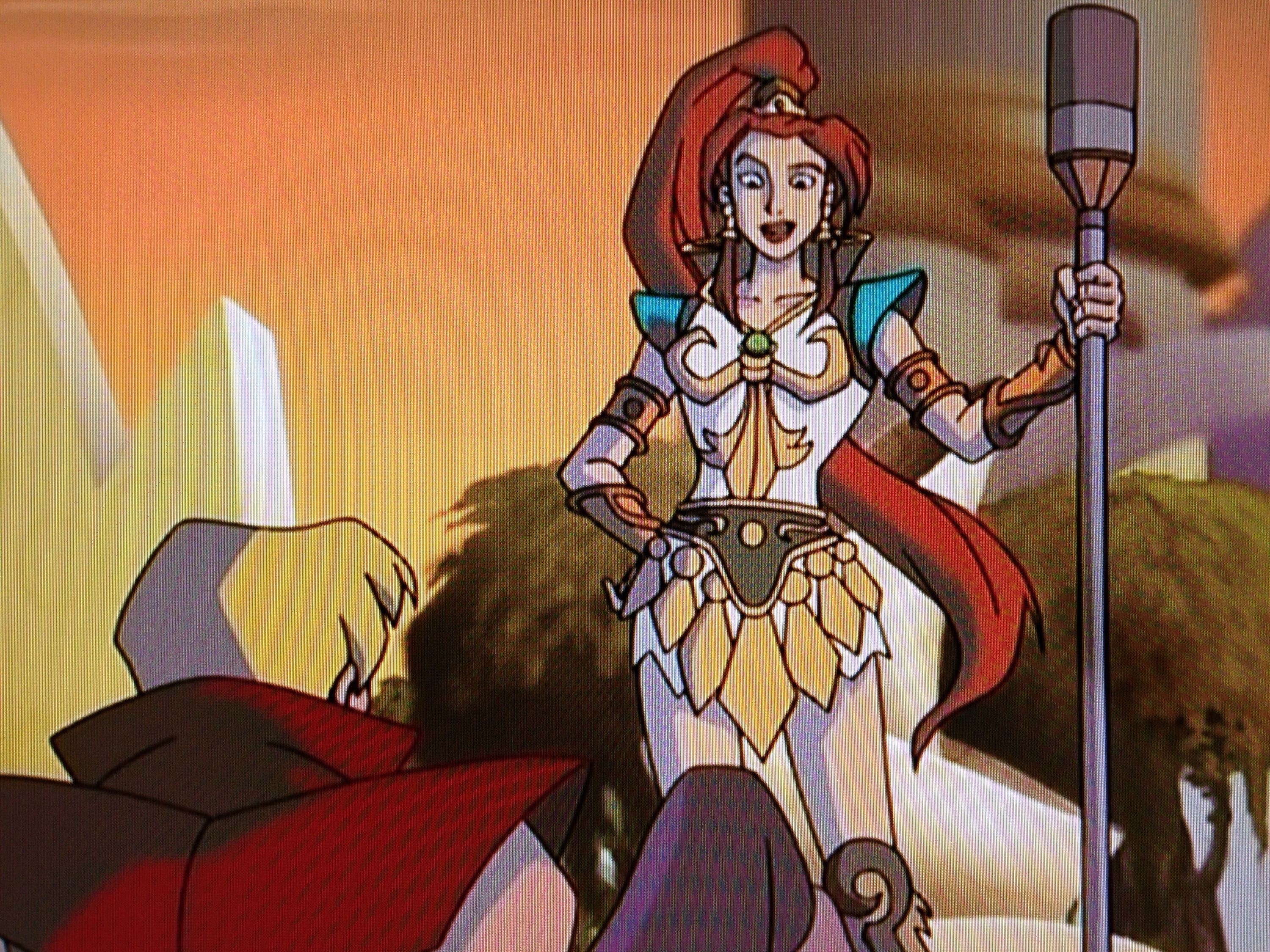 Back at the banquet, Randor offers up a toast to his son Adam, only to realize he’s not there. He and Man at Arms arrive at Castle Grayskull. Adam says it could use a coat of paint. He’s one of those interior design gays. A falcon screeches as the drawbridge lowers. They enter the castle. Category is, gothic chic. Gargoyles are everywhere, like tchotchkes. We enter a throne room, that has giant wings near it. The falcon cries again, and goes to land on the throne. Instead, it transforms into the Sorceress’ human form. She greets Adam by name, saying she knew this day would come, but didn’t think it would be so soon. He says it’s the same day every year. Next time he’ll invite her. Stupid, young, and narcissistic. Yep, he’s a ‘mo alright.