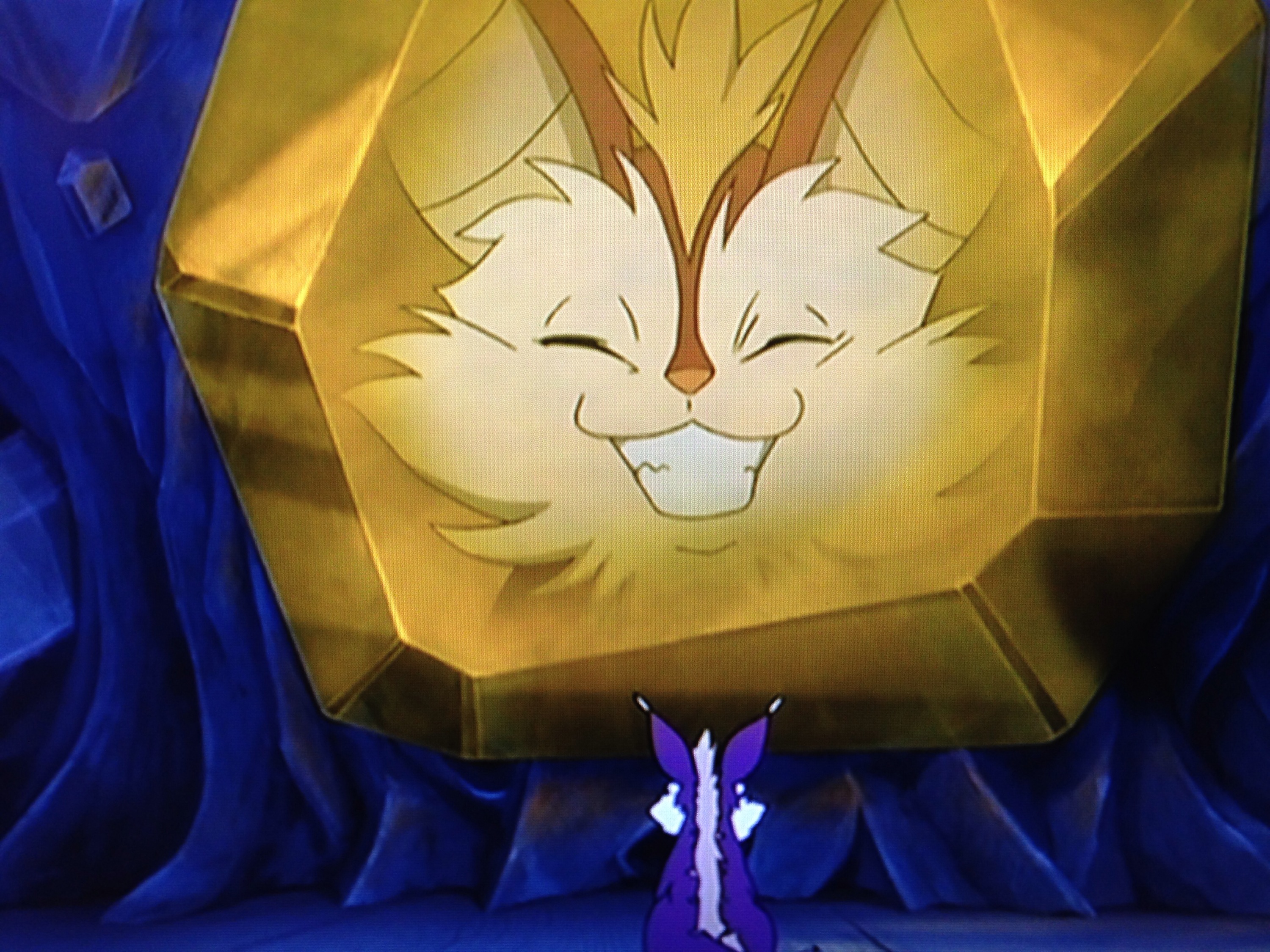 Lion-O watches as the lizards leave the city. Cheetara says she was right, and there is something different about him. Back in the square, kitty-cat Snarf is making faces at one of the crystals in the Trojan corruption stone. Snarf walks away, and we see a reptilian shadow in the crystal. Credits