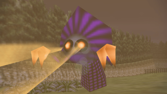 This whole game is a bit of a mind freak. As a direct sequel to Ocarina of Time, kid Link falls victim to the Skull Kid, and is transformed into a Deku Scrub. As the game progresses, he also takes the form of a dead Goron, Darmani, and dead Zora, Mikau. That’s right, Link takes on the form of some of the series’ various races, but, you know, dead. Do you know why he does it, Clarice? Why he takes their skins? Anyhow, since Majora’s Mask was recently re-released, I’m sure it’s fresh on everyone’s mind. That being said, the WTF moment of this game for me, takes place at Romani Ranch on the first night. Link has to help defend the ranch from aliens. Seriously, Cow. Snatching. Aliens. Of all the absurd and crazy things in this game, and becoming dead people was a biggie, but that’s the one that had me scratching my head, saying What the…?