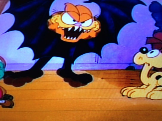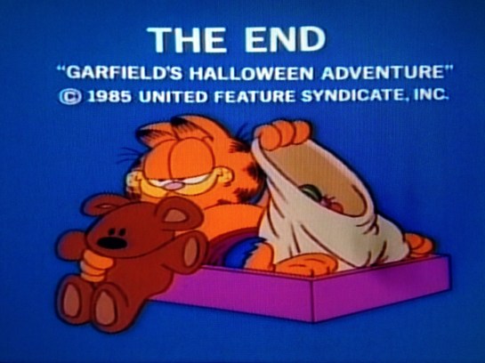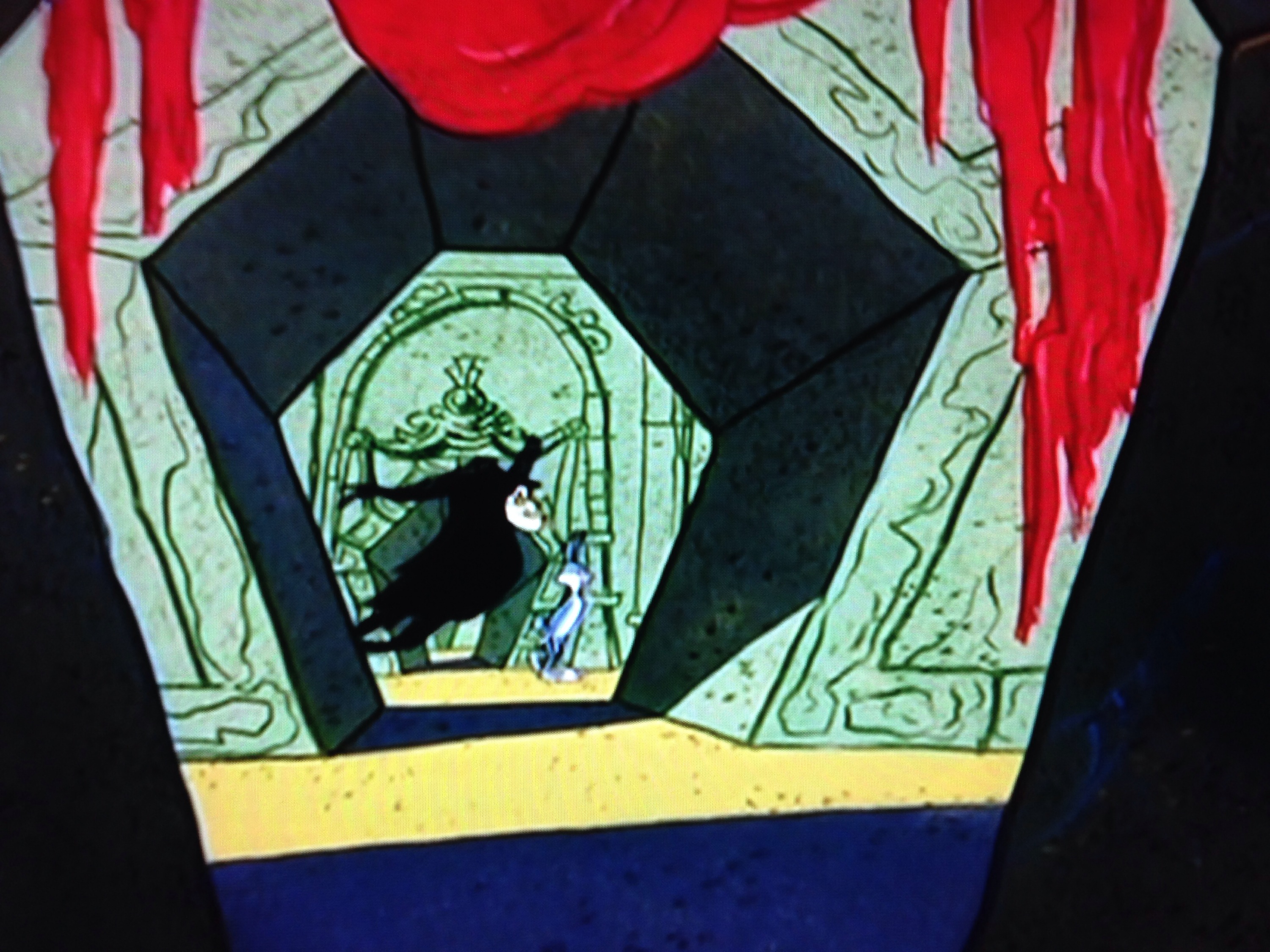 We open on a city. We can see a bell tower, backlit by the full moon, naturally. We hear a witch laughing as she flies through the sky. Based on the clock in the tower, we know it’s midnight. The witch scares the bats hiding in the belfry, and rings the bell, cackling the whole time. Then she approaches a black cat, raises her hat, and scares it. This witch knows how to party. She hops along the fence, stopping at a pumpkin. It turns, and is a Jack-o-lantern. This time she’s the one who gets scared. She and her broom hide behind a tree.