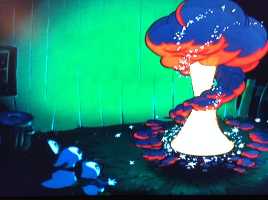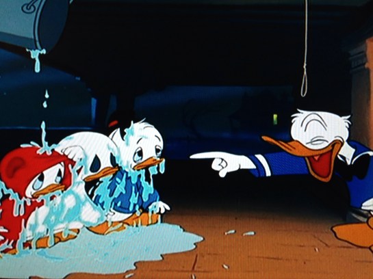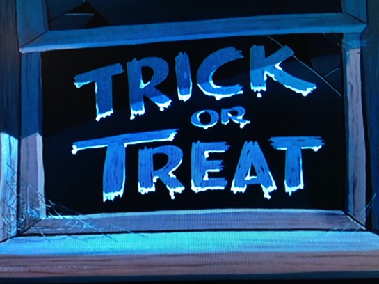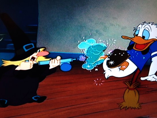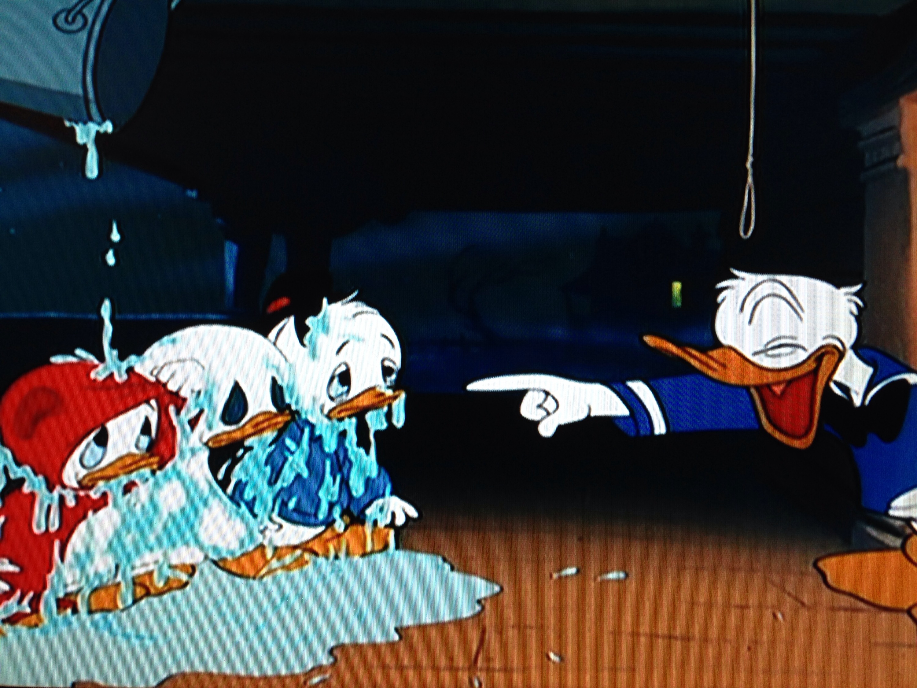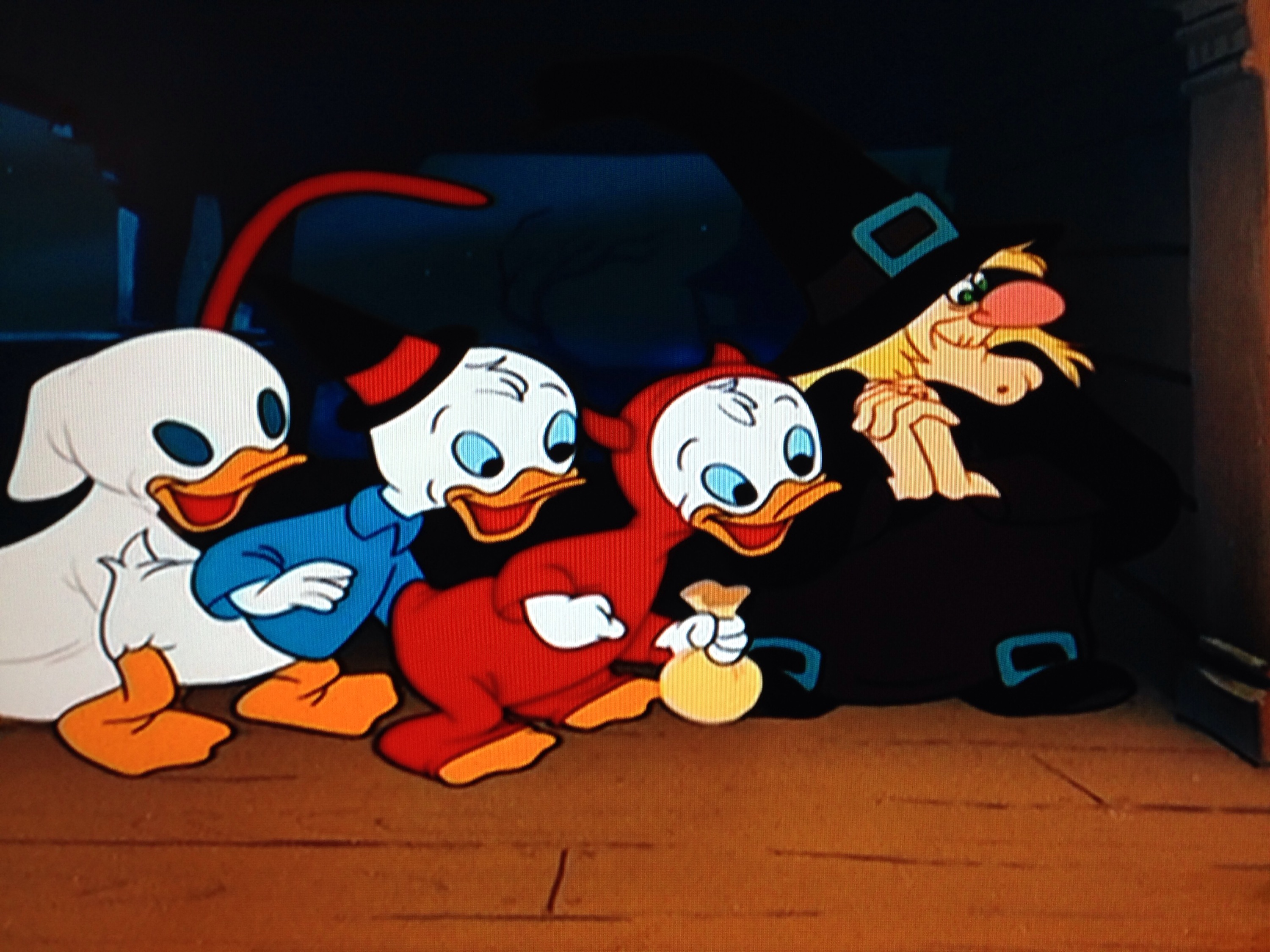 She watches as the pumpkin moves on the head of Louie, who is dressed as a ghost. Huey is a red devil, and Dewey is dressed as himself, but with a small witch hat and broom. As we established, it’s midnight. Why are these three still out trick or treating? They ring the bell, and Donald knows it’s them from his living room chair. Why is he still up waiting on trick or treaters? Where is his brother/sister to keep their kids in line? Anyhow, Donald moves his candy bowl, grabs the firecrackers behind it, and heads for the door. He greets his nephews, and they say their standard “trick or treat”. He puts something in each of their bags, and they thank him. For once, they didn’t start this. The firecrackers go off, and destroy their candy bags. It spooks the witch and her broom, Beelzebub, too. Donald laughs as the kids look upset. Personally, I’m a prankster, but you don’t mess with kids, let alone family, on Halloween. To add insult to injury, Donald gives them their trick too, and pulls a bucket of water down on the boys. He tells them so long, and leaves them to walk home. Alone. At midnight. With a witch in town.