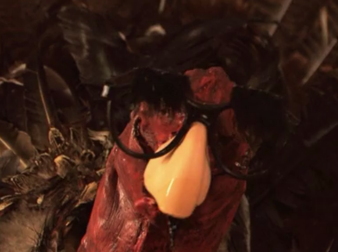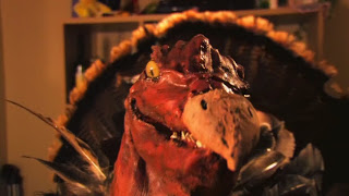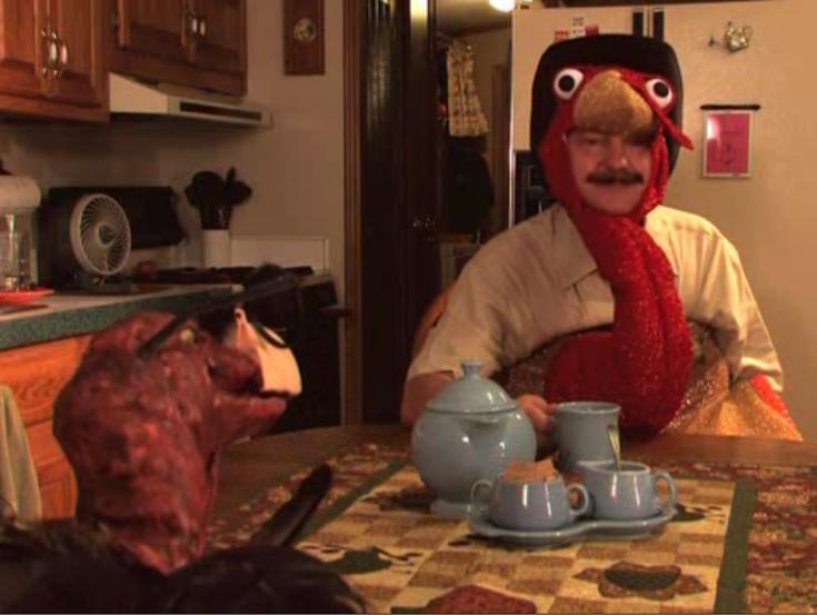 Her holiday joy is soon interupted, however, as there is rustling in the thicket and she struggles to get away. Before she can get to saftey, we catch our first glimpse of the killer. A puppeteered turkey head pops out of the bushes and utters the first of many zingers, “Nice tits, bitch!’ and kills her. And roll credits.