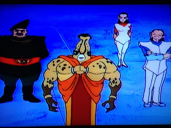Earth tells Space Xavier to continue his transmission. Well, at 1340 intergalactic standard time. Ugh! How did the whole galaxy agree on a standard measure of time for everyone? We can’t even get all fifty states to agree on daylight saving time. Anyhow, Mon Star, universal public enemy number one, though we never hear what his past crimes were. Intergalactic terrorist? Did he fly a cruiser into a space station on the 254th day of the year 2811? That’s a smarter joke than this show deserves. He went back to Penal Planet Ten and freed a group of the most dangerous criminals in this or any galaxy. Space Xavier asks if they’re getting that or if he’s talking to himself. Earth asks for visual material. Criminal porn? Space Xavier given them the rundown, including powers. Molecular can assume and shape, and is the undercover guy. Melodia is the mistress of evil notes. Whatever that means. I’m guessing a Starlord dance off would work against her. Mumbo-Jumbo is the strong man of the mob. Hardware is the weapons guy. Shocking. It’s like naming your daughter Bambi and being surprised when she’s a stripper. Windhammer is a storm master, with that blasted tuning fork of his. Yes, they say blasted tuning fork. Space Xavier says they could use some help up there. Good luck relying on Earthlings. We’re only twelve minutes in. Let’s do this, Clovers!
