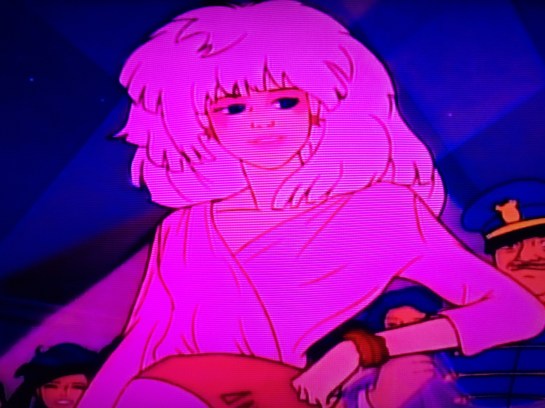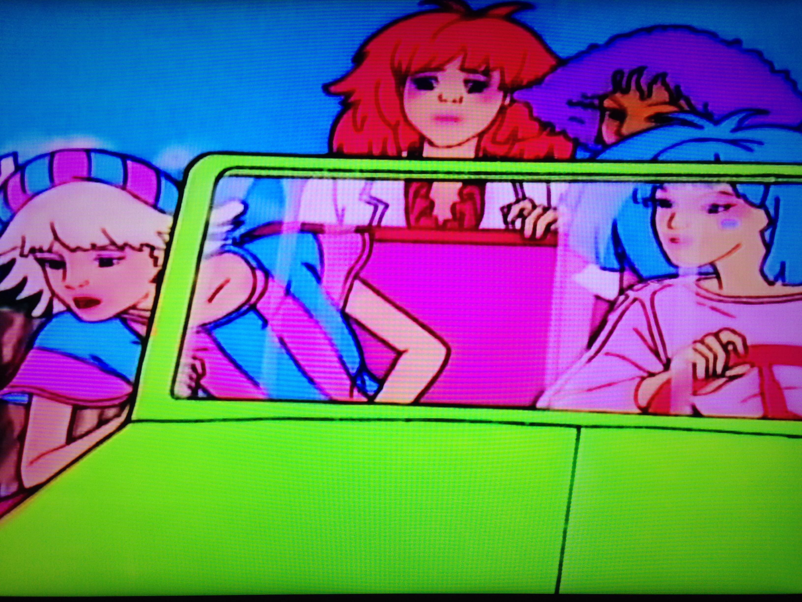 We open on a red carpet. There’s a blimp overhead that has JEM on it. As the spotlights move around, the land yacht of a car pulls up and out comes Miss Vida! Ok, it’s actually Aja, serving up blue hair, pink eye shadow and a star on her cheek. Next, Shana, in purple dress and matching purple hair. Followed by Kimber in red hair, and a white dress coat with red ruffles. Finally, Jem! Pink heels, pink dress, hair, and makeup. These girls are coordinated! Werk! One of the paparazzi ask if they’re making a new album, and what it’s like to be famous. She remembers how it all began…