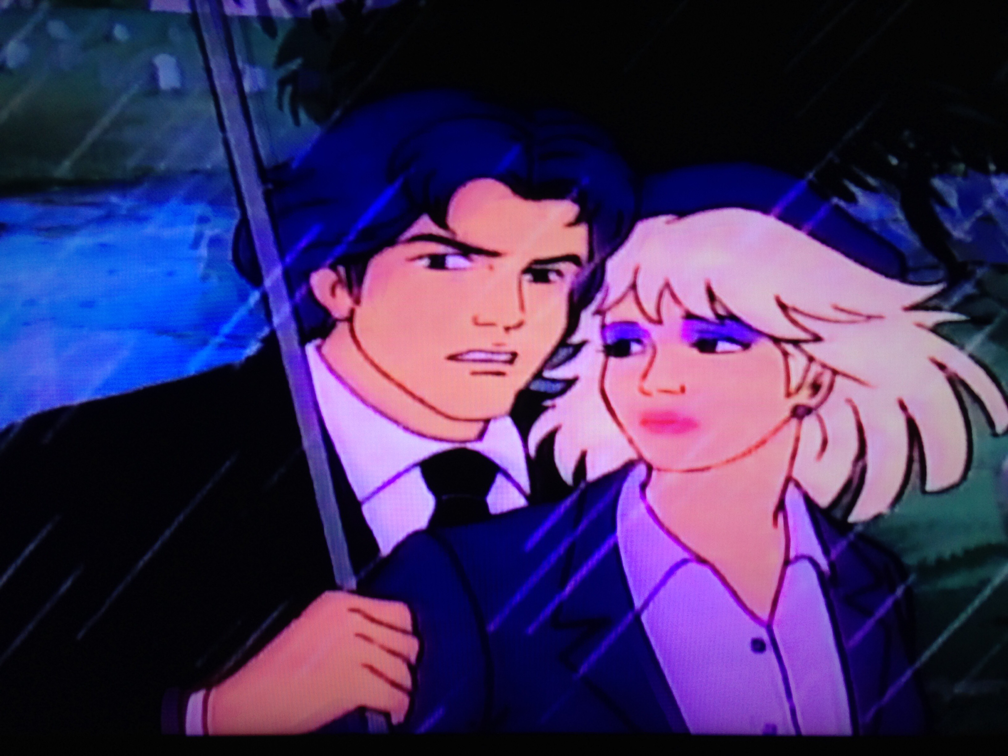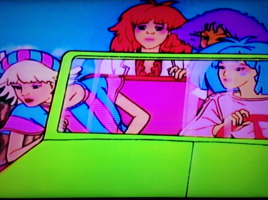 Starlight Music, Jerrica dusts off her knees and- kidding! Can you imagine? No? Well, you can now. Jerrica rides the external-facing elevator to the top and ask the secretary to see Mr. Raymond. Secretary has fingerless white lace gloves on, and is painting her nails. It’s worth noting her lime green eyeshadow. Even for the 80’s, wow. Anyhow, Jerrica storms in and asks if he’s making himself at home in her father’s office. Well, he is dead. It’s not like her can use it. She says she needs money for Starlight House, and daddy left her half the company. Why only half is beyond me. Raymond says that she’s just a kid. He’s trying to turn Starlight Music into the most powerful recording company in the country, but he needs new blood like, The Misfits! Pizzazz! Roxie! And Stormer! They come in on cue, riding guitar-shaped bikes. Yes, I’m serious. Pizzazz has an animal print dress and acid green hair. Roxie has white hair, a black top and yellow leggings. Stormer has blue hair, pink top, black mini skirt and fishnets. The music starts as they circle Jerrica. Time for a musical number! Yes, seriously! “Outta My Way” The Misfits appears in the corner like we’re watching a music video. Which we are. They stalk Jerrica out the glass wall of the office, surf after her on boards, and try to grab the brass ring she’s on at the carousel. All while singing for her to get out of their way. Subtle, ladies. Raymond announces a battle of the bands, that The Misfits say they’ll win cause he booked a bunch of terrible acts around them. Jerrica can’t believe he’s using her father’s company to promote this trash. He’s in charge and there’s nothing she can do about it. Don’t be too sure.