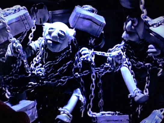 First things first, Michael Caine is a legend, and I adore him. Just had to get that out of the way. His portrayal of Scrooge is nothing short of brilliant. From the opening scene with Kermit and the bookkeepers, you really believe that he’s the mean miser he’s playing. Going from calm to yelling, and back again. You wouldn’t want him as a boss. I mean, threatening to fire the staff for wanting heat. Heat. In December. Pre-modern furnace and insulation. Gee, thanks, boss. His encounter with the Marley brothers leaves him shaken, but receptive to the idea of what’s about to happen. It isn’t until the creepy sex doll of X-Mas past takes him through his, well, past, that we get to see some more of Michael’s huge talent. We see him light up at happy memories, and tear up as he loses the love of his life. Even for a frosty queen like myself, I feel for the man. We all do. Everyone has lost at least one person in their lives. Driven to dance by the next spirit, we can see the light in Scrooge starting to grow. He then sees what his own nephew, and Kermit’s family, think of him. Despite getting an unofficial reading from Piggy, he shows concern for someone other than himself. You actually believe that he cares for the sick little frog. So much so that he asks about his future, leading to his final spiritual encounter. After being taken to the future, and learning of Tiny Tim’s fate, he doesn’t know how they can endure it. When the Reaper points him to a grave, Scrooge says that a life can be made right. He uncovers his own name, and cries. He states that he’s changed, and will honor Christmas all the year. Michael is so good, I believe him. He dresses, and goes to the streets, righting past wrongs from earlier, such as buying coal for his workers so they can be warm, donating to charity, and getting a feast together for Bob and his family. The gratitude feels so genuine, you can’t help smile. His performance is legen-wait-for-it-dary! Bravo, Mr. Caine! Bravo!