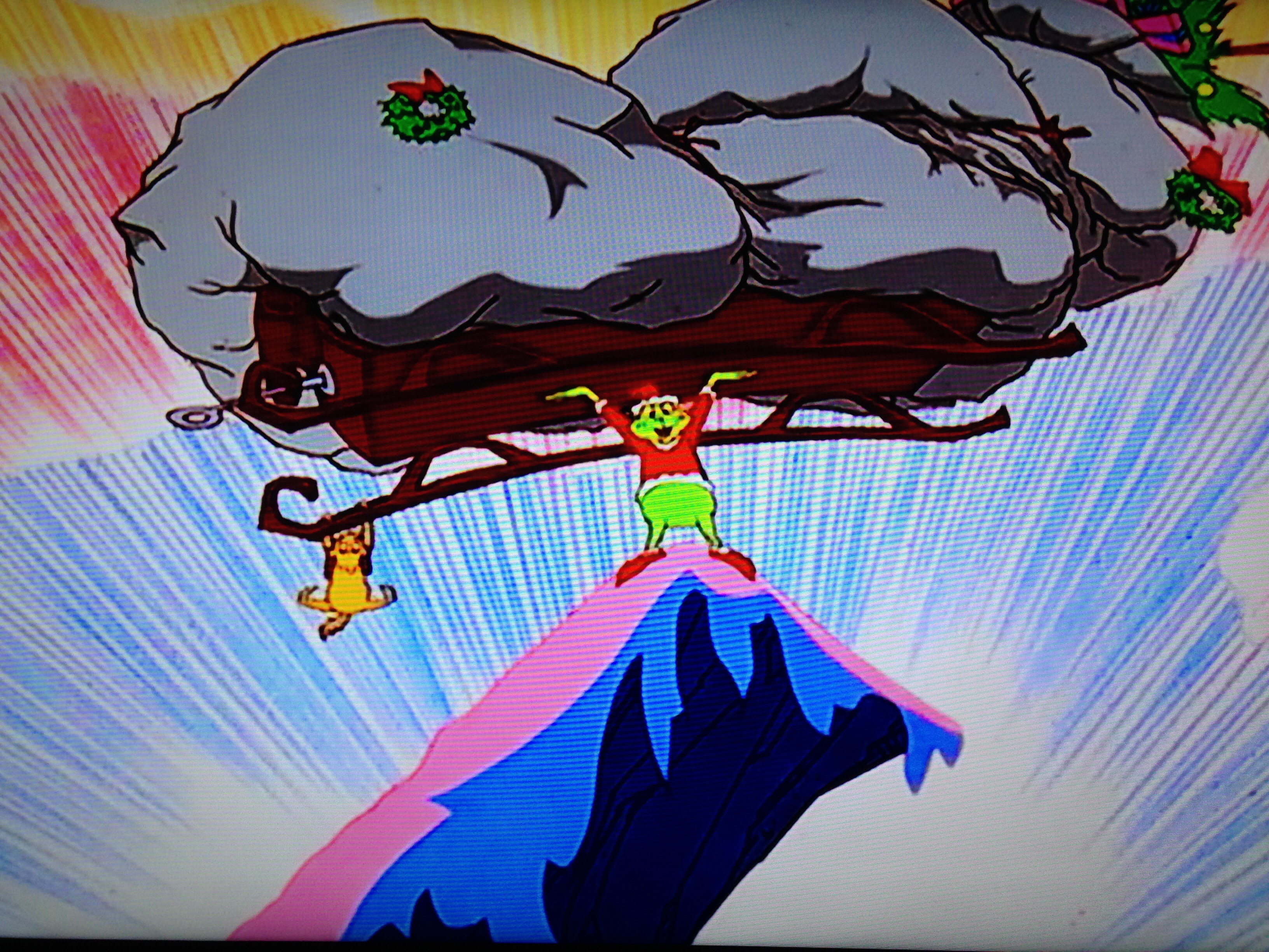The sleigh starts to go over the edge of the mountain, and realizing they’re gonna sing with or without presents, the Grinch decides to save them for whatever reason. Christmas miracle, or whatever. Dunno why hearing their singing didn’t annoy him this time. No, I’m not gonna let it go. It’s kind of a plot hole, if you ask me, which you didn’t, but it’s my review so I’m not gonna stop. Except I am. For now. He Grinch scrambles to save the sleigh, and Max too, cause might as well. He gets Max free, though more accident than on purpose, then goes to stop the sleigh. Which is on snow. Fighting gravity. Yay, toon physics! The Grinch’s small heart grew three sizes that day, and the true meaning of Christmas came through. He found the strength of ten Grinches, plus two. I know they needed the rhyme, but twelve. It’s twelve Grinches. Also, he now has an enlarged heart. Someone page Doctor Who. Yes! I’ve been waiting the whole time to break that one out! Now that his heart didn’t feel quite so tight, he whizzed with his load through the bright morning light. C’mon, I can’t ignore that one. What do you mean, let it go? This isn’t Frozen, and I’m not Elsa, I don’t have to let it go. Let it go! I am one with the wind and sky! Let it go! Let it go! You’ll never see me cry! Here I stand- You do not interrupt a diva during her number! The nerve! The cold never bothered me anyway!
