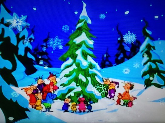 This is a Chuck Jones cartoon. He’s a legend in Looney Tunes land. You can already tell this is gonna be good. Like when you see the Trojan logo on your cond- um, where was I? Yes, the cartoon. Pan past a mountain as the snow falls. The song starts in the background, and I need captions cause Seuss made up some fun words that I just can’t spell. Fah who for-aze, dah who dor-aze. Welcome Christmas, bring your light. Fah who for-aze, dah who dor-aze. Welcome in the cold, dark night. As the Whos sing, hand in hand, they pick a tree, and topple it to take back to Who-ville. Welcome Christmas, fah who rah-moose. Welcome Christmas dah who dah-moose. Welcome Christmas, while we stand, heart-to-heart and hand in hand. Warm fuzzies as the Whos raise the tree in the center of town. There’s a song sung about decorating, which I will share with you in a moment. I’d like to point out that based on the song, it’s Christmas Eve, and the entire town is getting ready for the holiday. That’s a day away. As in tomorrow. I’ve never understood the decorate the day before people. Even if you don’t want to deal with it for a month, at least let yourself have it up for a week. Having things up is a good thing. I remember this one time, when- what? Fine, back to the song. Your loss. It was a good story. A man triumphed over impotence, and- alright already! Sheesh!
