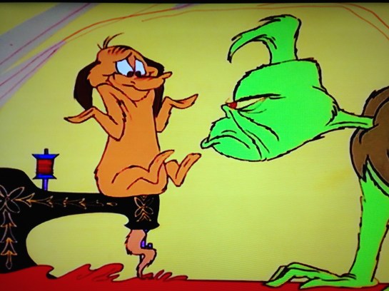 The more the Grinch thought of the Who-Christmas-Sing, the more he thought he must stop the whole thing. He’s been putting up with it for fifty-three years. He’s earned a little peace and quiet. Max comes out of the snow with a mock hat and bears on, and the Grinch gets an idea. An awful idea. A wonderful awful idea. He’ll make a quick Santy Claus hat and coat. The Grinch takes scissors to his curtains, like he’s Giselle in Manhattan or something, and You’re a Mean One Mr. Grinch starts up. Before I get into the awesome lyrics of the song itself, he spends the time using Max as his dressing dummy to make his outfit. Then to run his sewing machine, which catches Max’s tail.