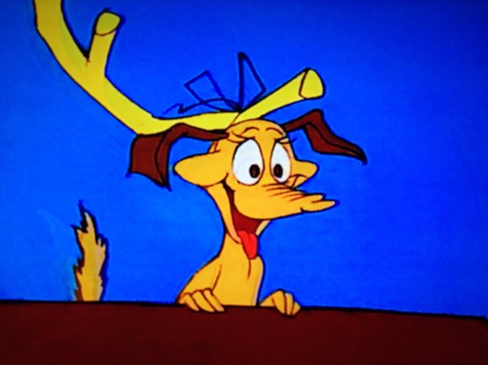 The Grinch admires his look in the mirror. Now he just needs a reindeer. Reindeer being scarce in the Land of Who, he decides he’ll just make one. Seeing where this is going, Max hides under the bed. The Grinch gets him out, and uses black thread, to attach a big horn to the top of his head. It topples Max over. He’s too horn-y. That one wrote itself. The Grinch removes some of the bulk from the horn, and Max is able to stand upright. He loads his ramshackle sleigh with some bags and sacks, and whistles for Max. Being a dog, he naturally assumed they’re going for a ride, and sits in the sleigh, wagging and happy. The Grinch breaks the forth wall to look at us, the goes to remind Max who the master is. Taking Max by the horn, he attaches him to the front of the sleigh, cracks the whip, yes on his dog, and they start towards Whoville. Max tries to run faster than the downhill momentum of the sleigh, and fails. He ends up under it, behind it, on it, pulled back to the front, upside down, clinging to the Grinch, then managers to stay ahead of it. I’d like to point out that the Grinch is about to do his burgling while the Whos are a-snooze. Why he needs Max dressed as a reindeer is beyond me. I get the point of his outfit, but Max is clearly a dog in a horn. Whatever, maybe the Whos are gullible. Spoiler alert, they are.