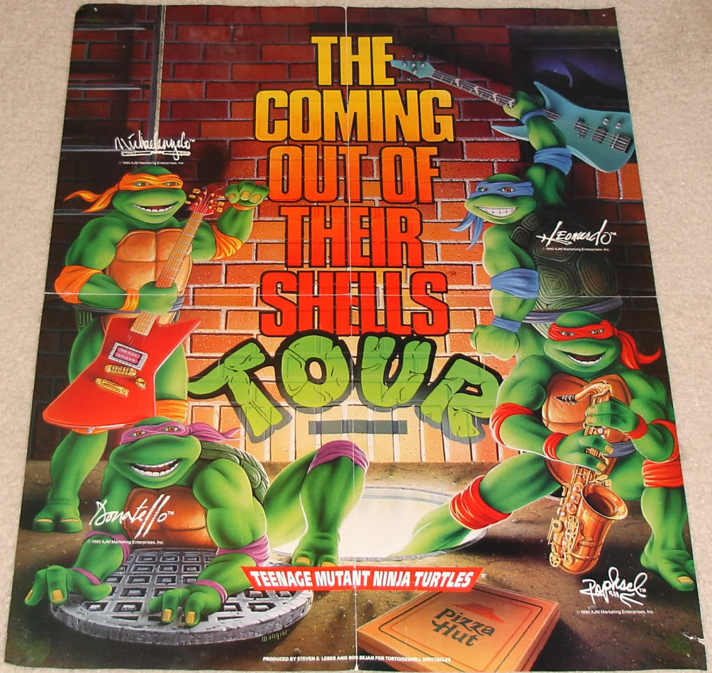 There are few things from my childhood that simultaneously were so endeared and so horrific at the same time as TMNT: Coming out of Their Shells. This was an amazing jammin rockin cassette that was put out by Mikey, Raph, Leo, and Don; and pimped out by Pizza Hut as a promotion. Because who else. It’s the turtles. There was even a song on the album, Pizza Power! No matter what challenges or problems life may hand us, just eat a slice of the “flying saucer food delight” and there isn’t anything these four ninja brothers aren’t ready to take on!!