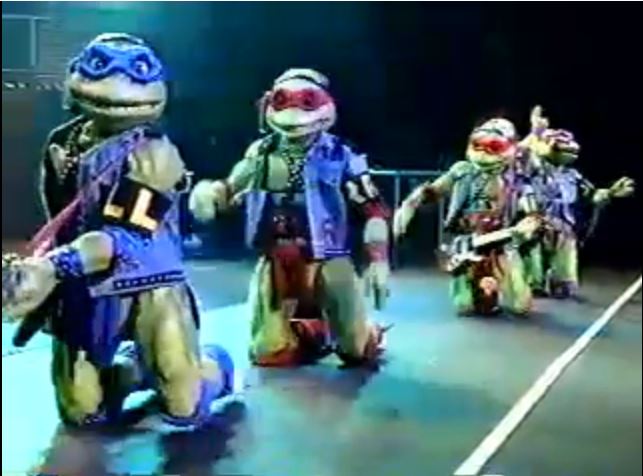 Apparently, the turtles had gotten tired of taking down the foot and shredder and krang and decided to take their rock show on the road with, wait for it, you guessed it, a LIVE TOUR!!!! Thank the gods that technology has blessed us with YouTube, so that we all may relive the turtles’ message of peace and love through music. I emplor you to try and sit through all 93 glorious minutes. I can already see the quizitive look on all of your faces. Bevianna, you say, 93 minutes? I thought the album was only 30? And I say to you, yes, ninety-three minutes of what-the-fuckery stretching 30 minutes of turtle pun themed pizza advertisements into an hour and a half of your life you will never, I say, never get back. You have been warned.