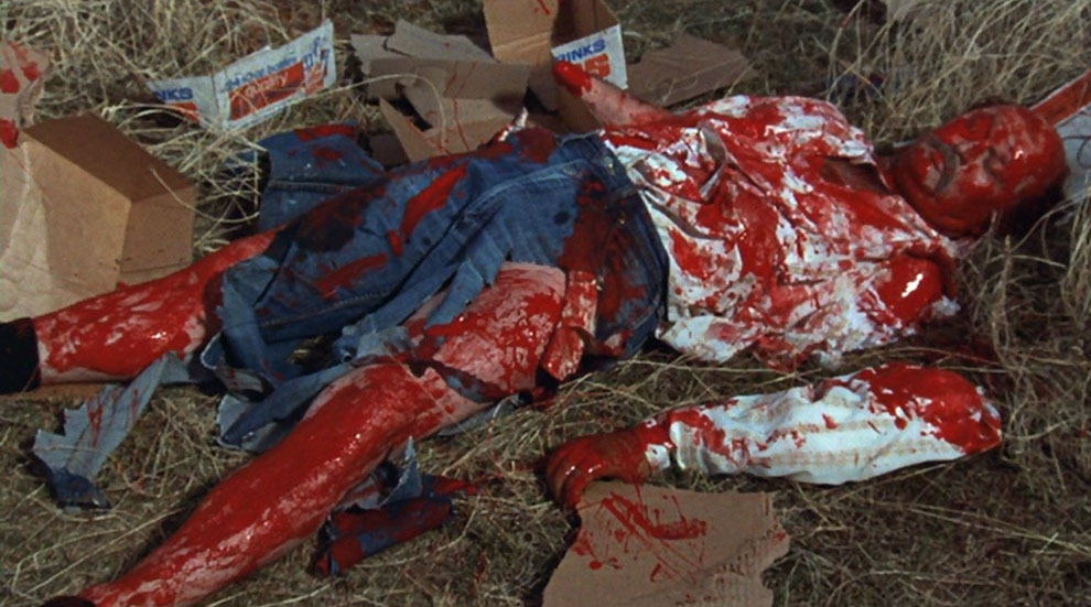 An indeterminate period of time passes before people start being killed by giant slow motion rabbits. They eat a refrigeration truck driver, along with the contents of his truck, and even a group of people at a picnic ground. Well, “eat” may be a stretch, what we see is people smeared with thick red paste and their clothes ripped, but never anything else.