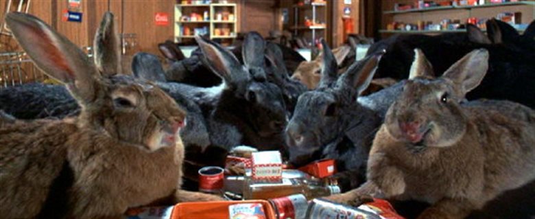 Despite those large incisors, there are not even chunks missing out of the bodies. Hell, nobody is even scratched. I thought the rabbits were hungry. Did I miss the part where it is explained why the rabbits are suddenly carnivorous? None of the characters are surprised either; once they accept the idea that giant bunnies are loose the change to a meat diet is totally ignored. Why bother with the details.