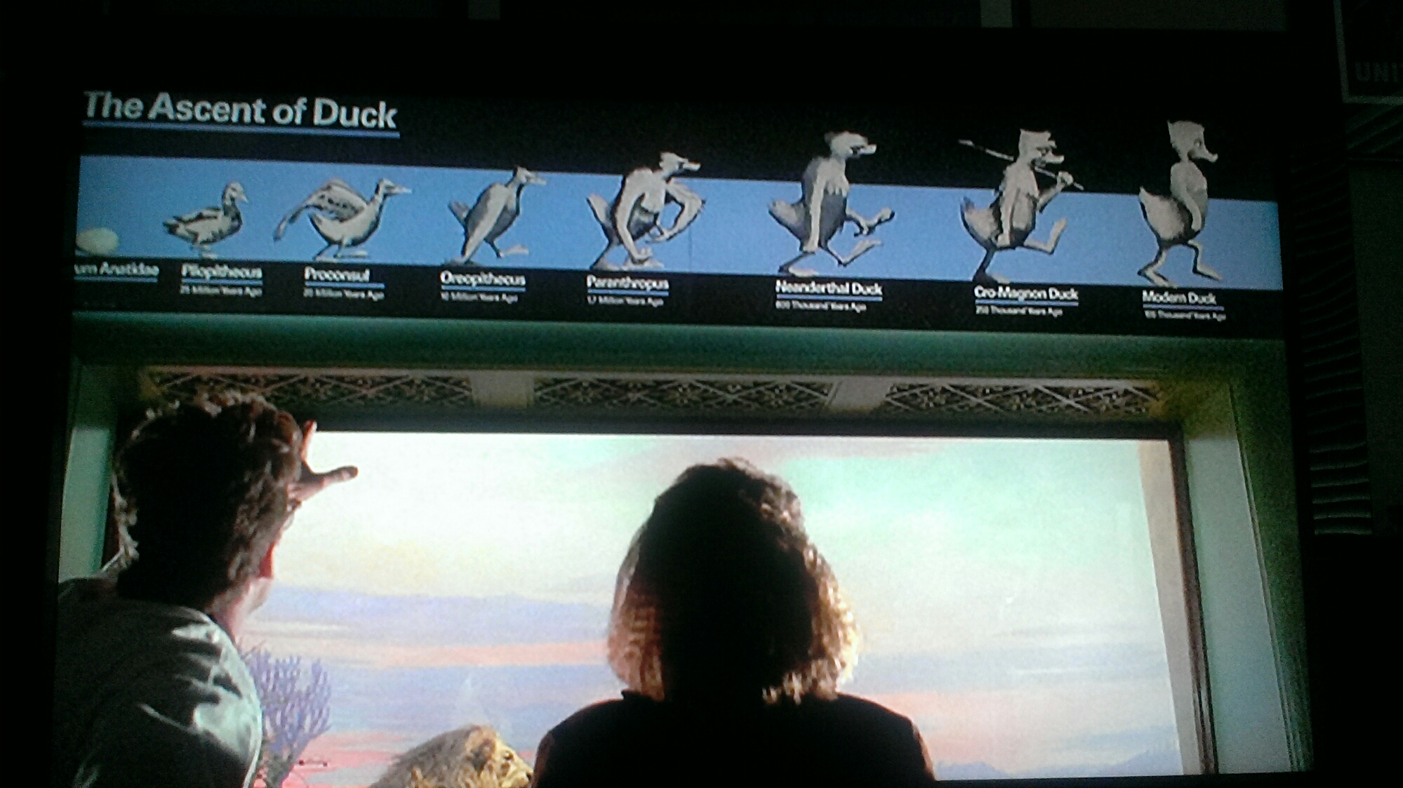 Enter a very young Tim Robbins as the budding scientist Philsy and soon to be best pal to Howard, but we don’t know that yet. He further insults Howard by asking him a series of absurd questions and Howard gets fett up and is ready to leave.  Philsy explains to him a theory of duck evolution that every schoolduck knows and determines that this avenue is a waste of time.